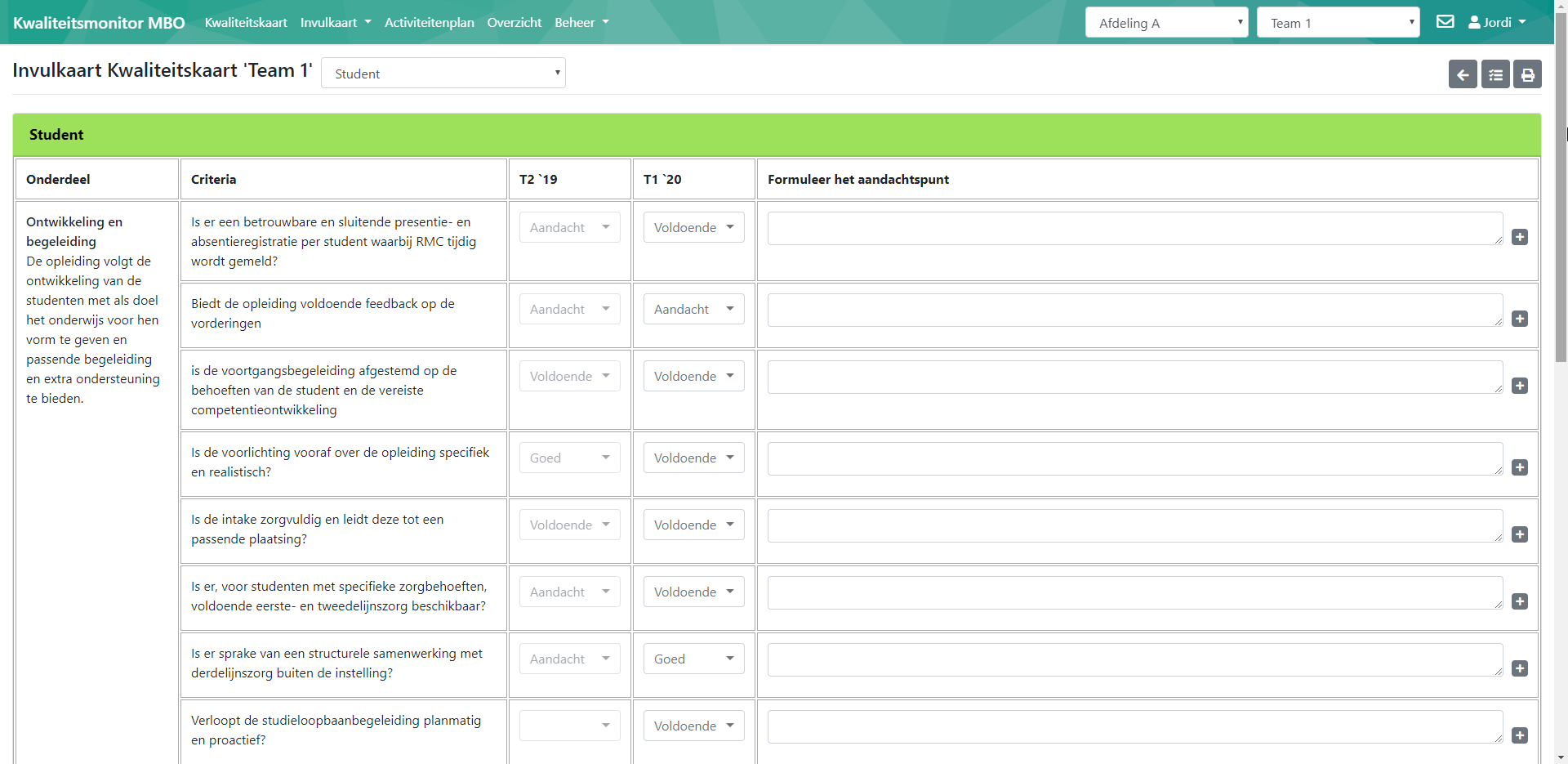Achter de kwaliteitskaart zit een invulkaart waar de onderliggende vragen ingevuld worden door de team verantwoordelijke. Andere gebruikers kunnen deze details ook bekijken, maar niet aanpassen.