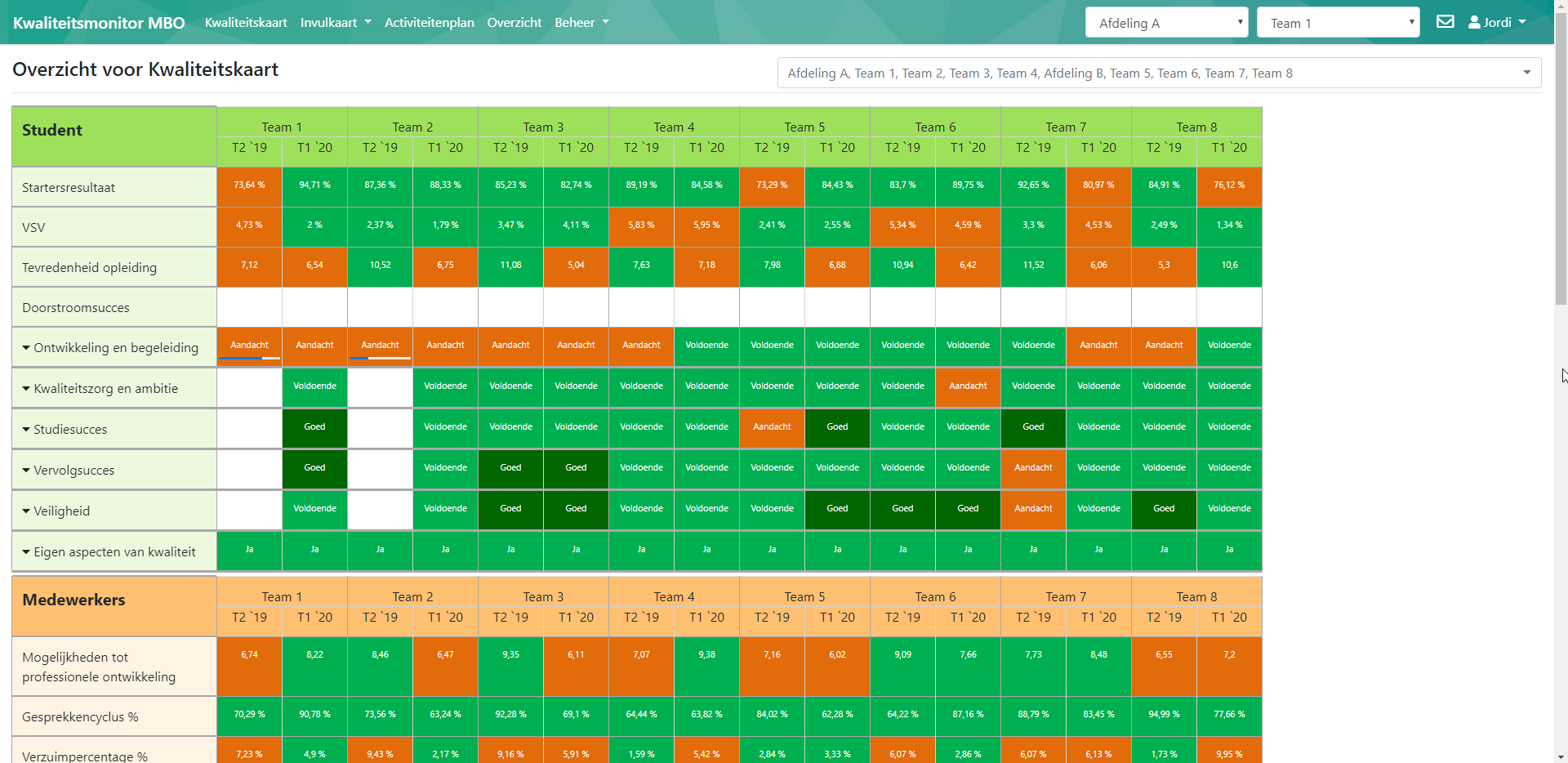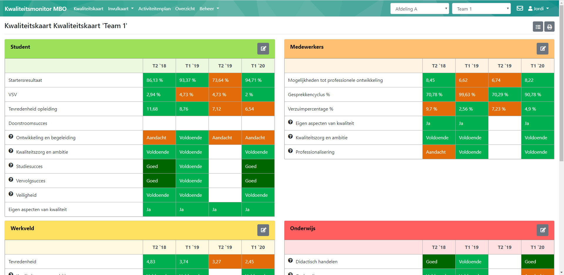 Op de kwaliteitskaart kan een team zien hoe ze ervoor staan. De kwaliteitsmetingen van de voorgaande periodes worden naast elkaar gezet en gekleurd om snel overzicht te bieden.
